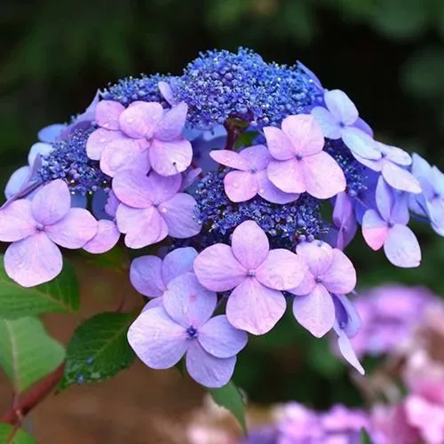 Главная ценность сорта — шикарные кружевные соцветия lacecap, состоящие из крупных краевых и мелких центральных цветков. Цветение начинается с июня и продолжается до октября, при этом сорт образует цветки как на прошлогодних, так и на новых побегах, обеспечивая стабильное и продолжительное декоративное воздействие. Диаметр соцветий достигает 15 см, плотные шапки состоят преимущественно из стерильных краевых цветков. Окраска цветков изменяется в зависимости от почвы: на кислых субстратах лепестки становятся голубыми, на нейтральных и щелочных — розовыми, что позволяет создавать индивидуальные цветовые акценты в саду. С приходом прохладной осени оттенки становятся более насыщенными и глубокими, усиливая декоративность.